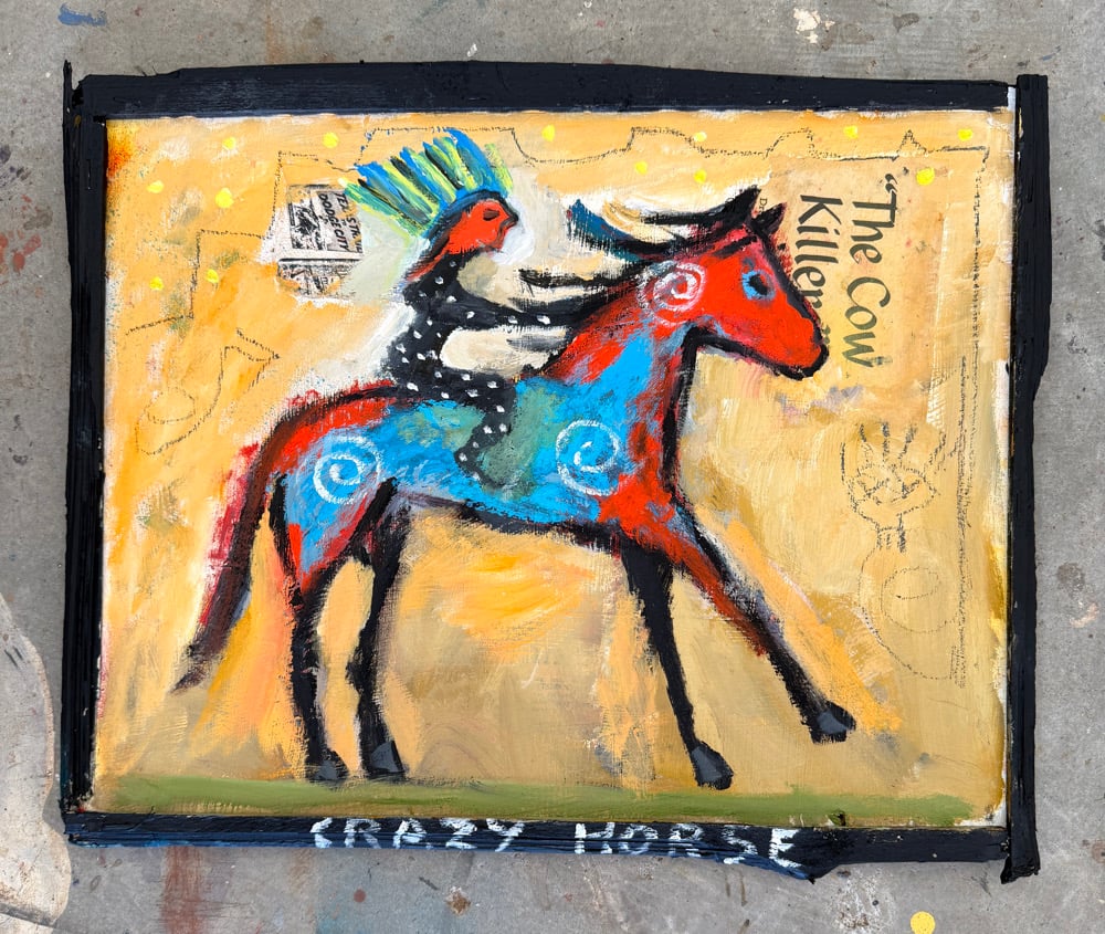 11” x 14” original signed oil painting with vintage collage on board with rustic handmade black wood framing! Ready to hang right out of the box.