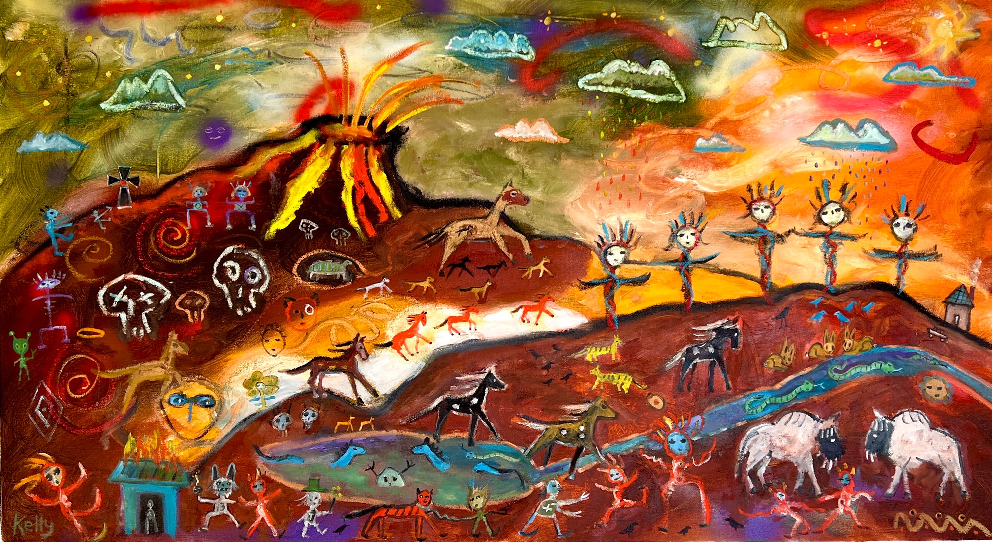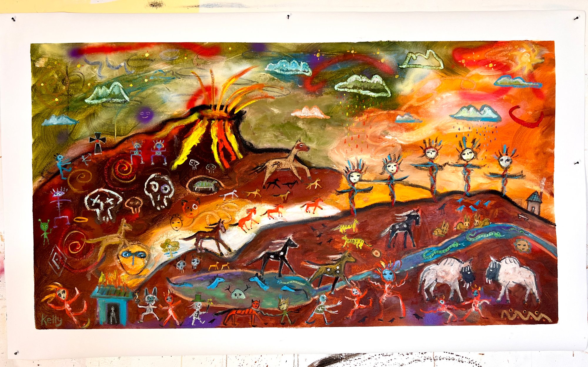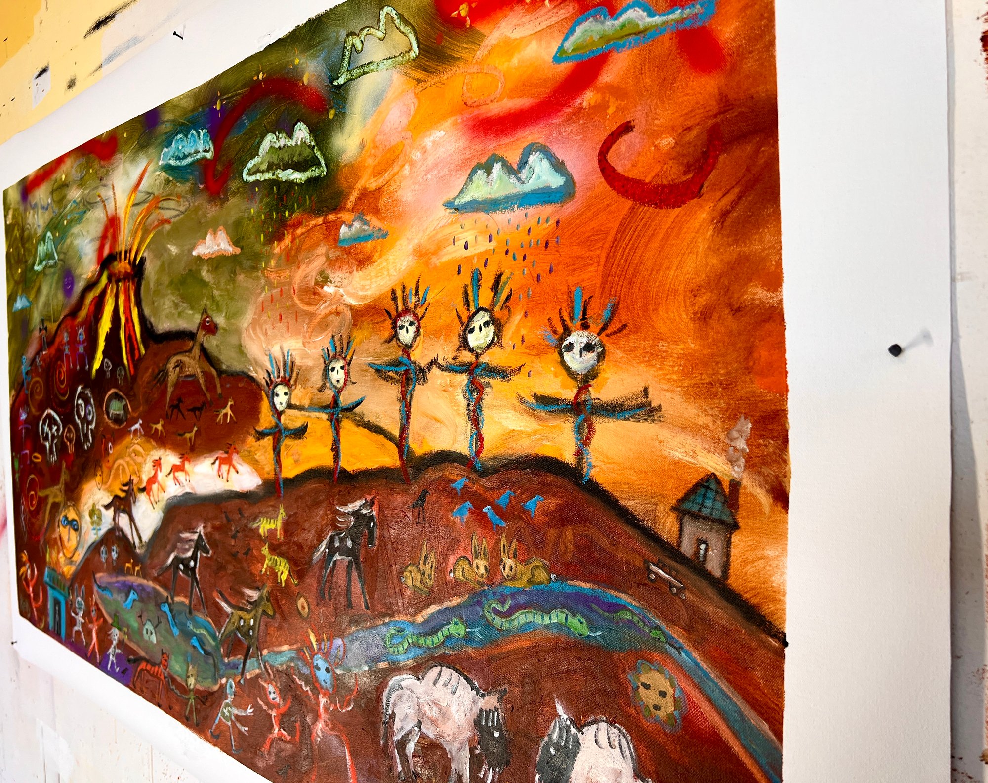 Approximately 62” x 36” signed original oil painting on loose canvas, which you can hang as is like a tapestry (I use carpet tacks for this) or take to Michael’s or your local frame shop for stretching. Has an approx. 3” white border (included in measurements).