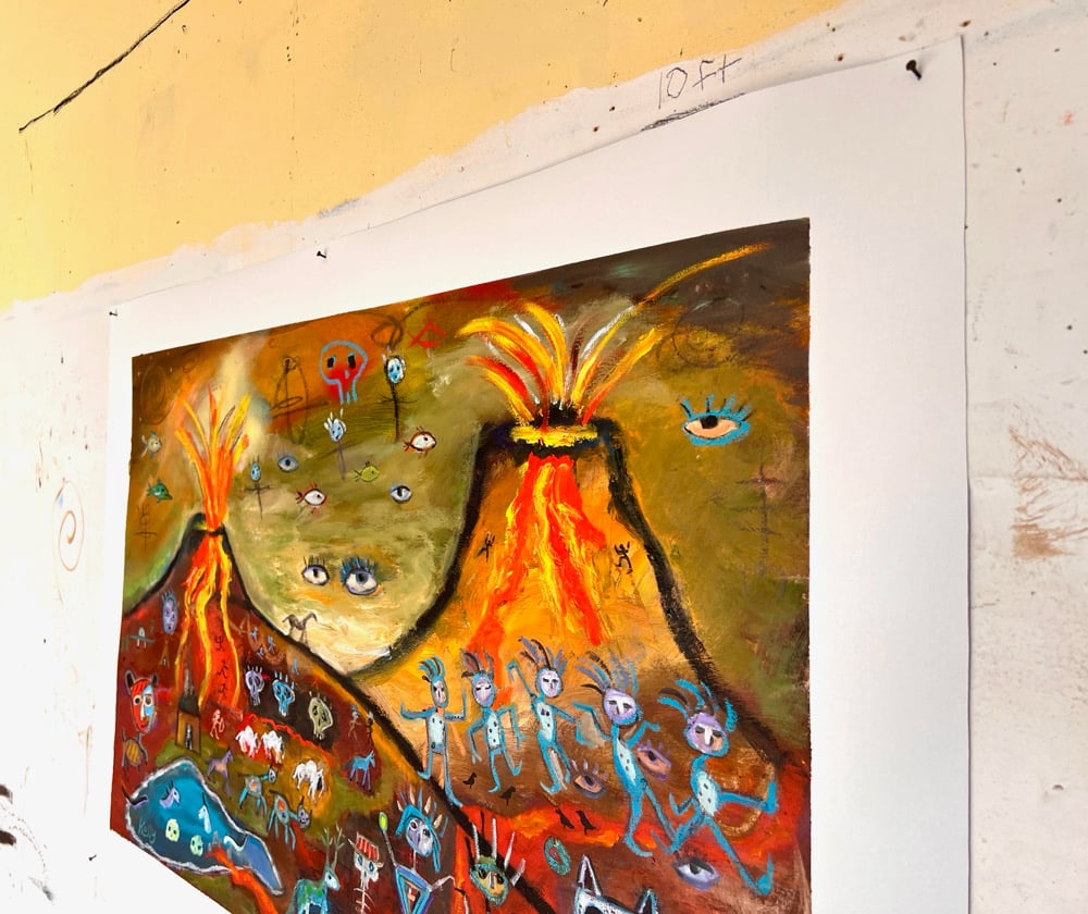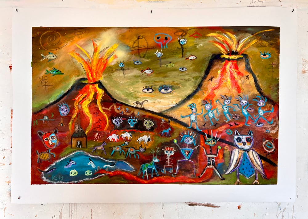 Approximately 49” x 34” signed original oil painting on loose canvas, which you can hang as is like a tapestry (I use carpet tacks for this) or take to Michael’s or your local frame shop for stretching. Has an approx. 3” white border (included in measurements).