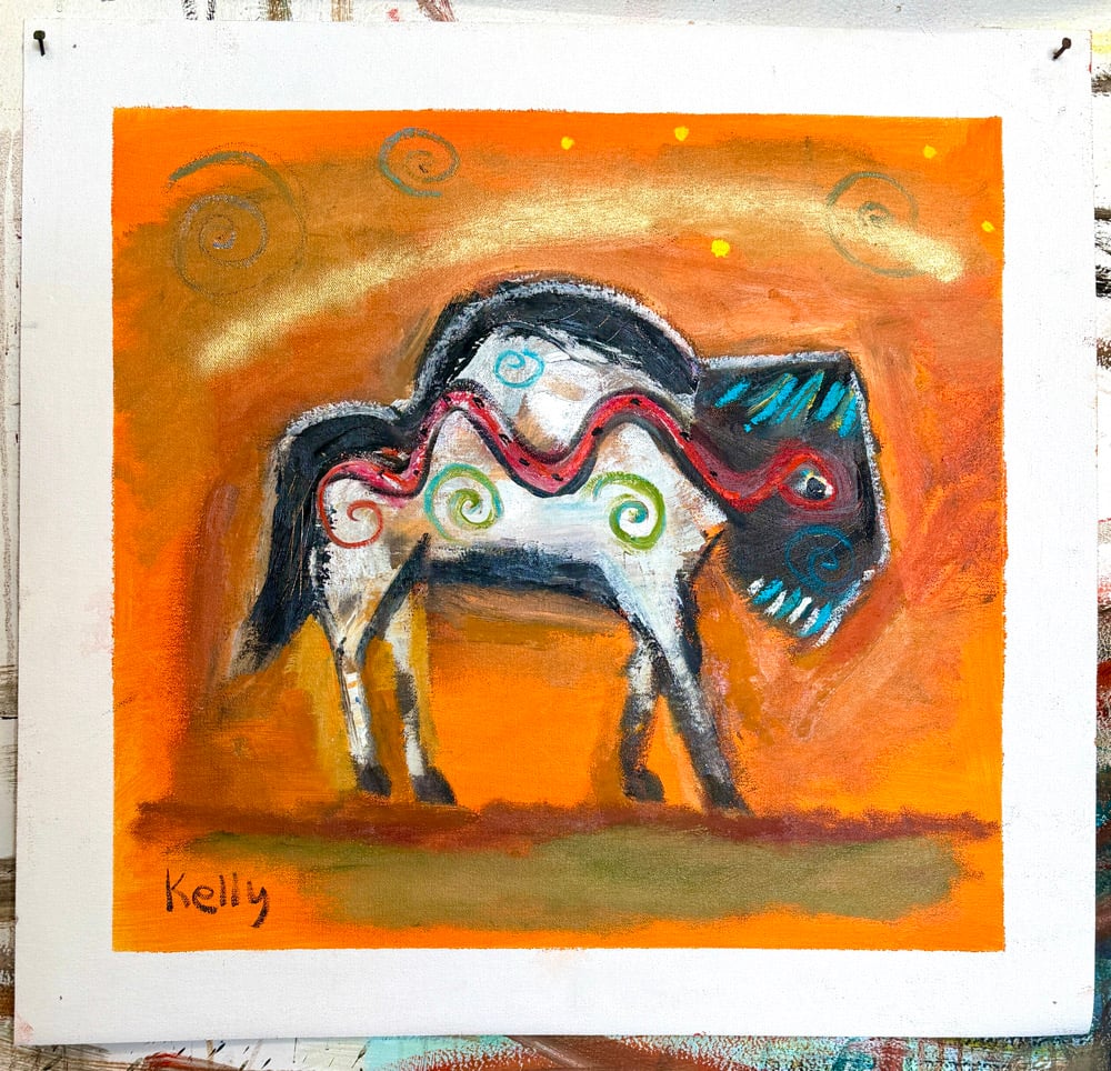 Approximately 20” x 22” signed original oil painting on loose canvas. Measurement includes an approx. 2” white border. You can hang as is like a tapestry (I use carpet tacks) or can take to your local frame shop or Michael’s to have it stretched or framed.